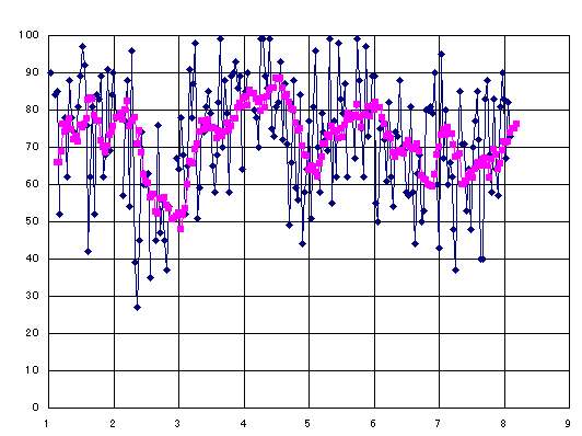 調子の周期ですが,少なくとも今年になってからは,ほぼ2ヶ月周期になってますね.具体的には,偶数月の下旬から奇数月の上旬が谷で,奇数月の下旬から偶数月の上旬が山でしょうか.去年1年を見てもそんな感じがします(スペクトル描いてみる?).年末年始は,これにぴたりはまりますし,少しずれますが,卒論,修論提出後,GWもだいたい対応しています(だからそうなってるだけ?).