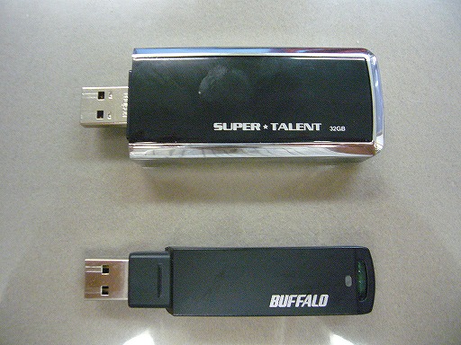 そうそう,USB3.0接続でraid0で構成したSSDのUSBメモリというのも1軒だけダントツ(半値くらい)に安い店があったので買ってみました(でも最初認識せずに突っ返したら,異常なしですって返ってきてちゃんと認識できるようになってたのは...).まあわかってはいたのですが,でかいです(^^;↓(下のはやや大きめのふつーのUSBメモリ).