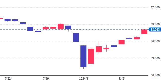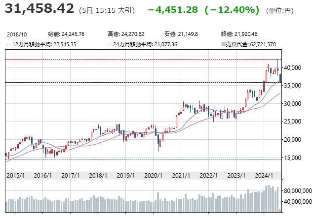 いや,チャートは,昨日までしか描いてなくて,今日の終値が31458円なので,今回の暴落の方が大きいですかね(最高値は42224円で,そこから25%以上下げてる).いや,新型コロナの時の高値が24803円で,底値が16552円で33%以上下げてるので,まだそっちの方が大きいですね.