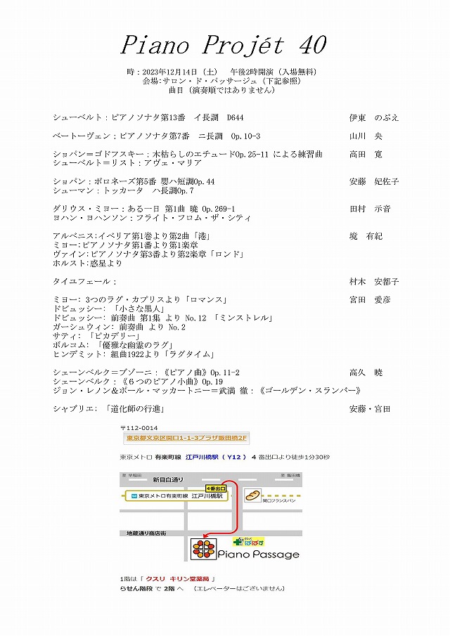 そっか,ピアノプロジェ40ってことは,ピアノプロジェ自体がアニヴァーサリーということですね.初期の頃は,年に何回かやってたようですが,その頃は,私は未参加で,私が参加し始めたのは,1994年の東大ピアノの会の創立20周年演奏会+パーティーで宮田が誘ってくれてからで,その頃以降は年一だし,40年くらい続いているというのがやっぱりすごいです(伊東さんのおかげです).