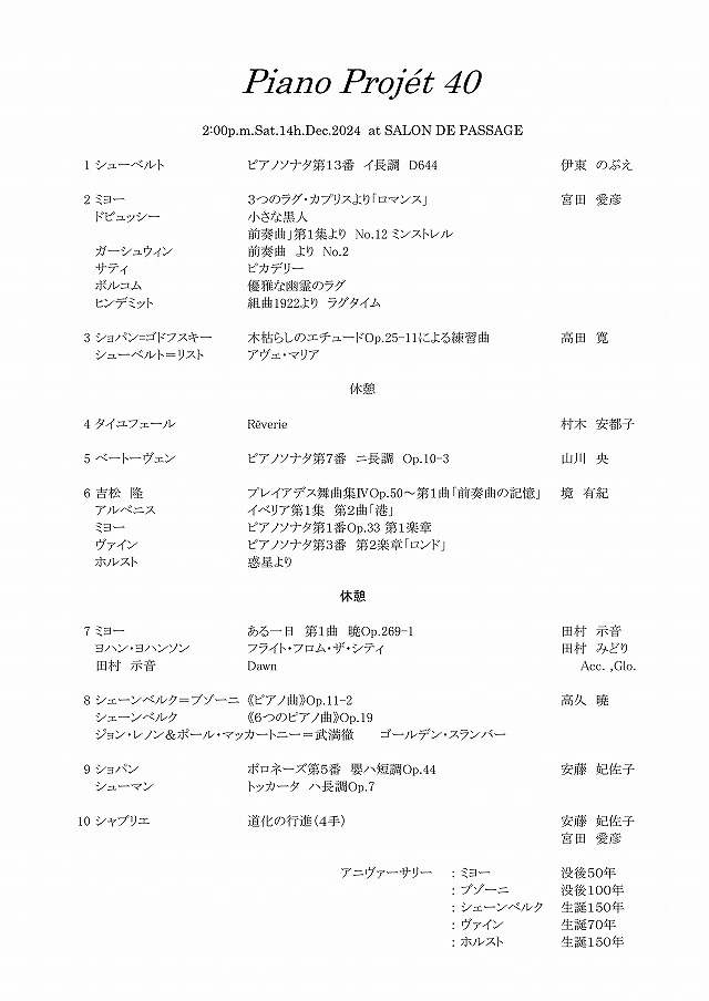 先日,ピアノプロジェが終了しました.当日のプログラムです(一部,誤植を修正).