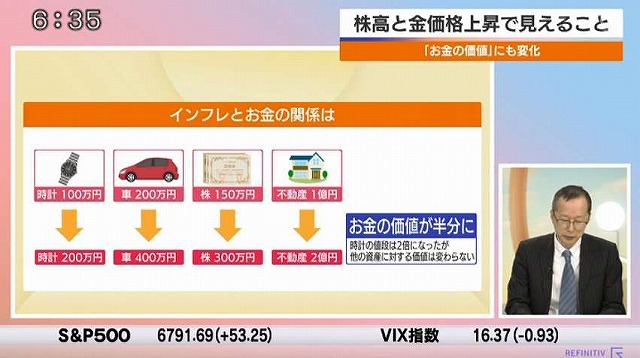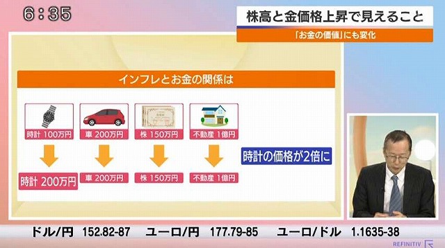 時計以外も全てのものの値段が上がるのがインフレで,これが何を意味するかというと,お金の価値が下がったということです.