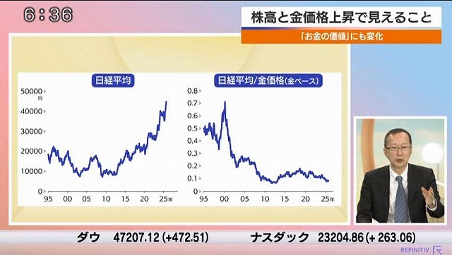 それで,株高(下の左図)ということなんですが,インフレということは,基準になるお金(円)の価値が下がっているので,基準をお金(円)ではなく,金(ゴールド)ベース,つまり,日経平均が何円じゃなくて,何オンス(どれだけ金が買えるか)という単位で見たのが下の右の図で,実は,株高どころかだだ下がりで,
