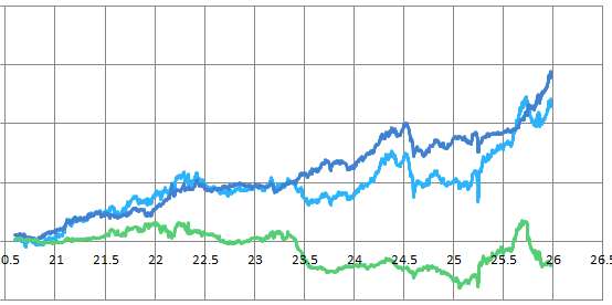 運保は,モロにその影響を受けて,年初は,負けが込んでずるずる資金を減らして行きましたが,Tランプ関税で,一気に跳ね上がり,1日で得た利益としては,見たことがない桁が違う利益になった日もありました.その後も,順調に推移して,9月くらいには,指運は,このまま行けば,年利150%(資金が2.5倍)という状態になりましたが,一転して,T市総裁当選,K明の連立離脱で一気に利益を減らし,その後も連戦連敗で,結局,指運の年利は28.5%でした.(買いだけやる)資保は, 商社(+建設)株が27.1%,商品先物が40.2%,外貨(は,玉が建ってないことが多くて)が4.1%なので(数字は,いずれも含み益も含めたもの),今年は,まあまあというか,そこそこ益が出た年にはなりました(↓は,青が資保,緑が指運で,水色が合計).