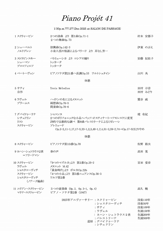 まず,経緯的には,ここのところの失敗を考えて,弾く曲をリストとスクリャービンのプレリュードに絞りました(総演奏時間25分くらい).リストは,弾きやすいし暗譜もできていいウォーミングアップになるかなという感じで,スクリャービンは,没後110年というアニバーサリーということで,生涯に渡って書いた90曲ものプレリュードを通して,初期,中期,後期,そして,更に次の音楽へということを感じさせる最後のOp.74で締めくくるという企画もの?で,Op.17-5以外は,無謀と言えるような難しい曲はないと思っていました.