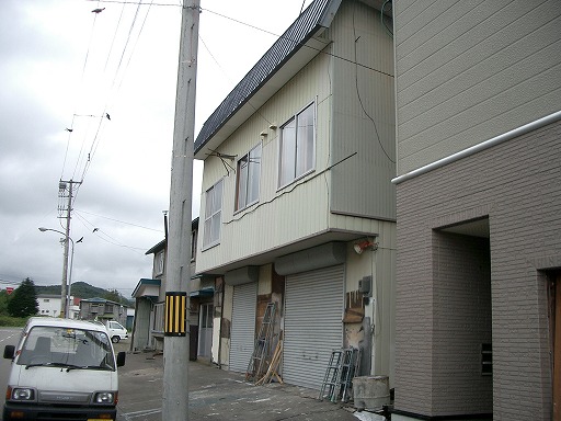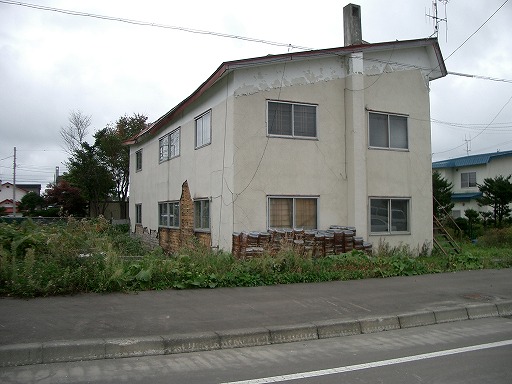・外壁にひび割れが見られるアパート↓.地震による被害かどうかは不明.