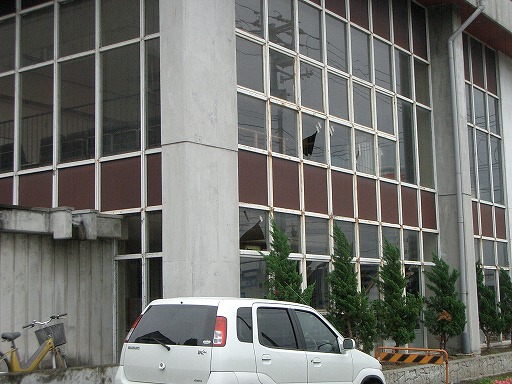・池田町役場庁舎の正面から見て左側(東側)の建物もガラスが破損↓