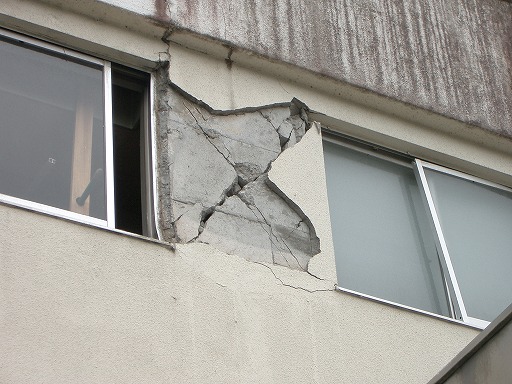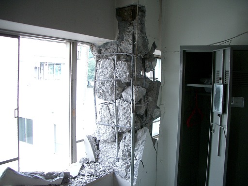 最も大きな損傷を受けた外柱を内側から見る.横補強筋はピッチが粗く,端部