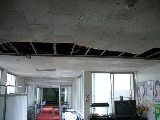 鹿島台国保病院左手前の瓦屋根建物の横の家屋の屋根瓦にも被害