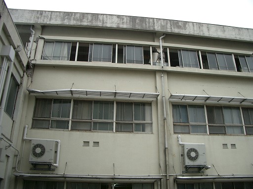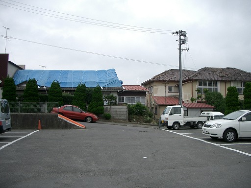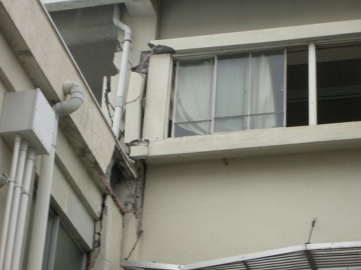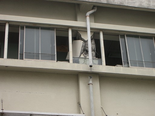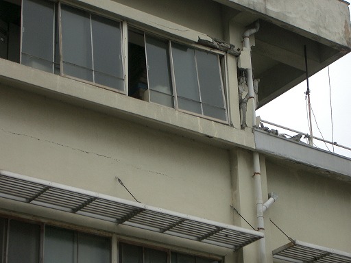 建物の3階部分.建物建設年は,左手前(瓦屋根に被害)の建物が昭和38年,