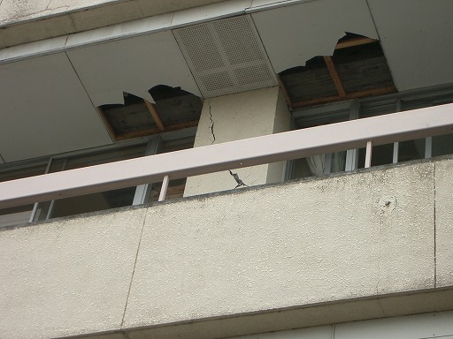 せん断ひび割れが見られた南側2階柱のクローズアップ