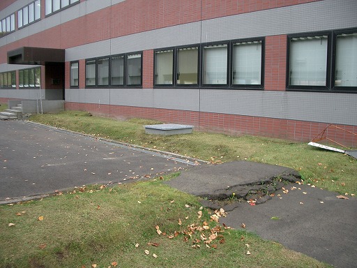 ・役場建物の陥没によると思われる建物周囲の地盤の被害↓