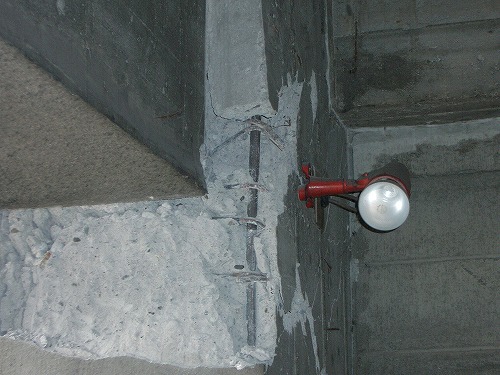 鉄筋は丸鋼.横補強筋が90°フックではずれている.