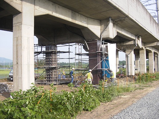 鋼板を巻き付けて溶接し,隙間にモルタルを流し込む,