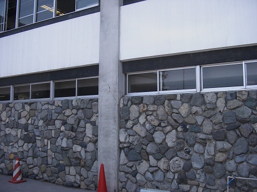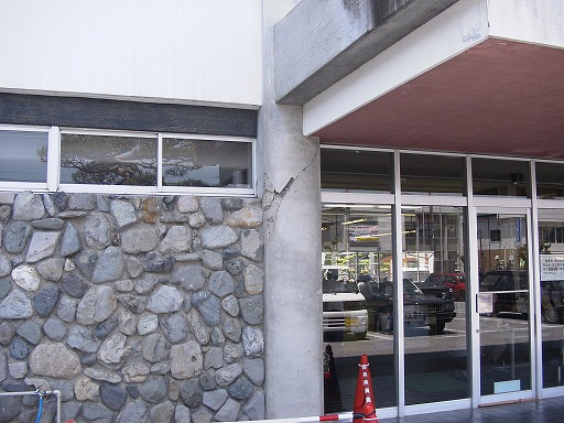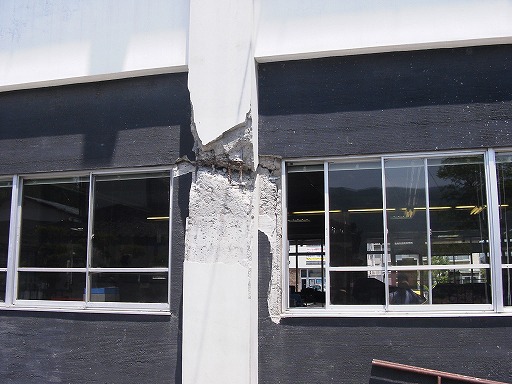 非常に高い腰壁により極短柱化し,せん断ひび割れ.