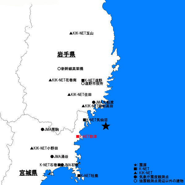 K-NET歌津観測点およびその周辺